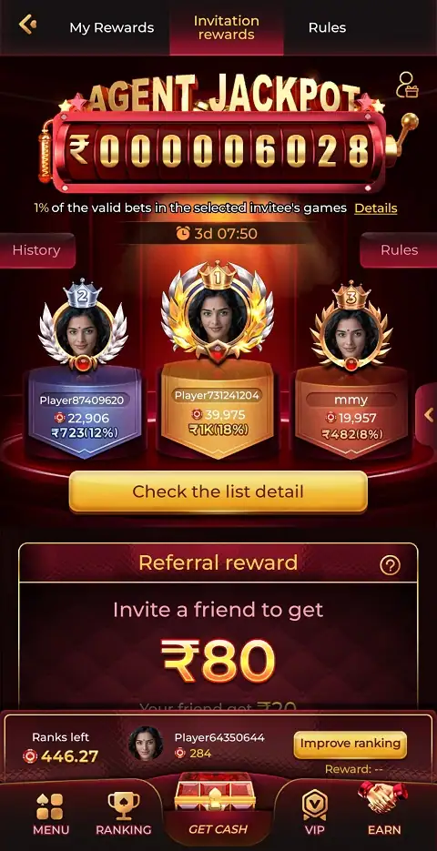 Turn your social circle into a source of passive income. For every friend you invite who registers and recharges, you receive 80 Rupees instantly. Additionally, you earn a lifetime betting commission from every game your team plays.